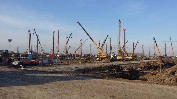 本工程主要特點(diǎn)為“短、平、快”。工期緊,任務(wù)重,施工場(chǎng)地狹小,投入機(jī)械設(shè)備和人員眾多。高峰期投入旋挖鉆機(jī)40臺(tái)、潛水鉆6臺(tái)、鏟車42臺(tái)、挖掘機(jī)7臺(tái)、吊車44臺(tái)、HZS120型攪拌站一套、35型攪拌站一套、90攪拌站一臺(tái)套、罐車31臺(tái),項(xiàng)目施工的人員達(dá)918人。由于地層條件復(fù)雜,場(chǎng)地地層較軟,現(xiàn)場(chǎng)采用灰土拌合硬化,部分區(qū)域鋪設(shè)鋼板配合施工,有效的解決了場(chǎng)地困難問(wèn)題,通過(guò)精心組織,保證了工程優(yōu)質(zhì)高效實(shí)施。
