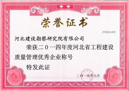 近日,根據(jù)河北省建筑業(yè)協(xié)會(huì)冀建協(xié)字[2105]25號(hào)文《關(guān)于繼續(xù)開(kāi)展河北省工程建設(shè)質(zhì)量管理優(yōu)秀企業(yè)評(píng)選表彰活動(dòng)的通知》,我公司榮獲“二〇一四年度河北省工程建設(shè)質(zhì)量管理優(yōu)秀企業(yè)稱(chēng)號(hào)”。
