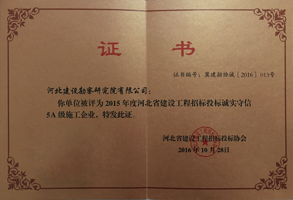 公司獲評(píng)2015年度河北省建設(shè)工程招標(biāo)投標(biāo)誠(chéng)實(shí)守信5A級(jí)施工企業(yè)單位