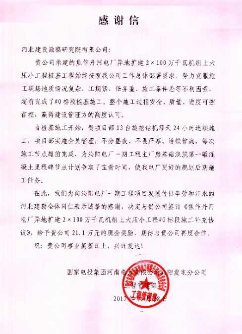 我公司承建的焦作丹河電廠異地?cái)U(kuò)建2×100萬千瓦機(jī)組上大壓小工程樁基工程,始終按照業(yè)主工作總體部署要求,努力克服施工現(xiàn)場(chǎng)地質(zhì)情況復(fù)雜、工期緊、任務(wù)重、施工條件差等不利因素,超前完成了#0標(biāo)段樁基施工,整個(gè)施工過程安全、質(zhì)量、進(jìn)度可控在控,贏得了建設(shè)管理方的高度認(rèn)可。11月28日,國家電投集團(tuán)河南電力有限公司沁陽發(fā)電分公司工程管理部發(fā)來感謝信,對(duì)我公司項(xiàng)目部員工表示感謝,并期待與我公司的再度合作。