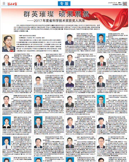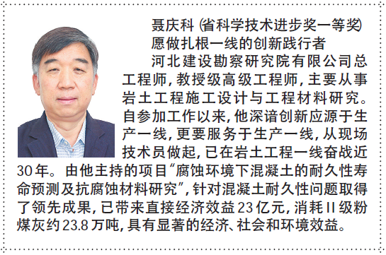 6月5日,河北日?qǐng)?bào)專版文章《群英薈萃 碩果累累》對(duì)2017年度河北省科學(xué)技術(shù)獎(jiǎng)獲獎(jiǎng)人風(fēng)采進(jìn)行展示。我公司的完成的《腐蝕環(huán)境下混凝土的耐久性壽命預(yù)測(cè)及抗腐蝕材料研究》獲得一等獎(jiǎng),聶慶科總工程師作為第一完成人在專版文章中進(jìn)行了刊載,這是以聶總為代表的廣大專業(yè)技術(shù)人員的共同光榮,也必將激勵(lì)我們更加努力爭(zhēng)創(chuàng)新的科技成果和榮譽(yù)。