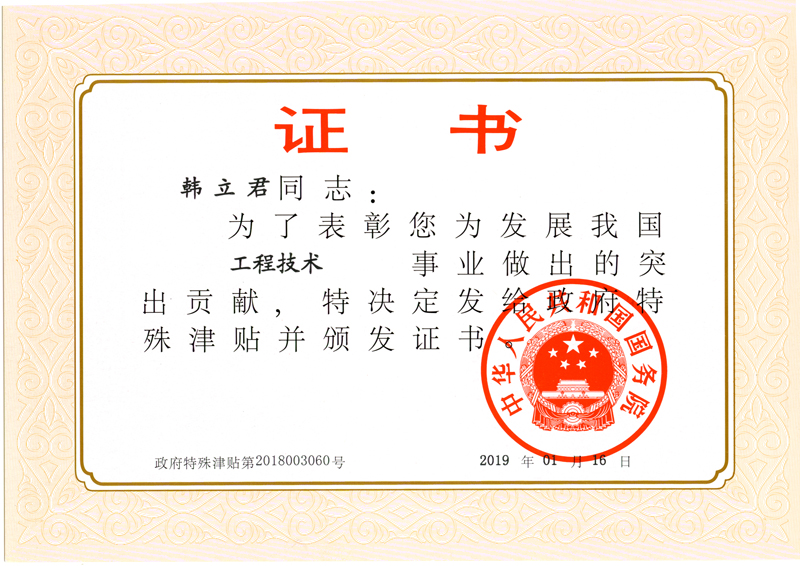 經(jīng)石家莊市人力資源和社會保障局選拔,河北省人力資源和社會保障廳推薦,人力資源和社會保障部組織評審,中華人民共和國國務院批準,公司董事長韓立君入選國務院政府特殊津貼專家。