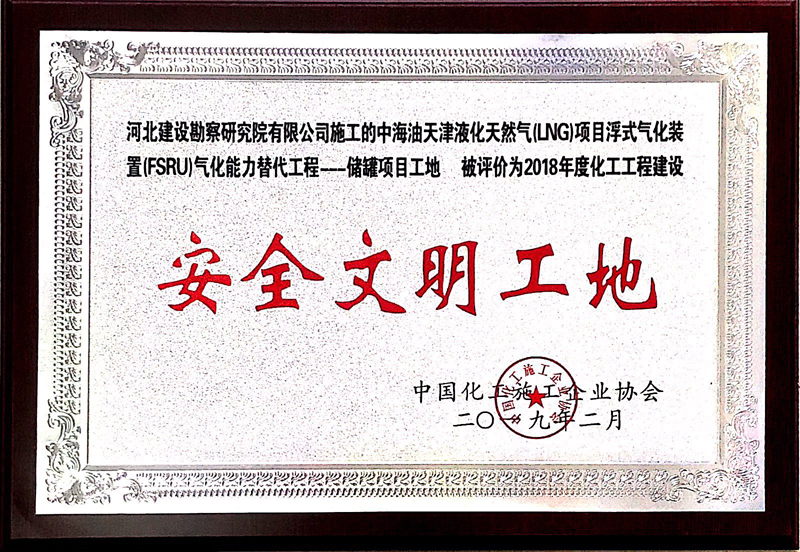 近日傳來喜訊,我公司承接施工的中海油天津液化天然氣(LNG)項目浮式氣化裝置(FSRU)氣化能力替代工程-儲罐項目樁基工程工地被評為2018年度中國化工工程建設(shè)安全文明工地,紅彤彤的證書不僅是榮譽(yù)和驕傲,也是對我們中海油天津LNG替代工程項目部全體員工付出汗水的最好回報和肯定。