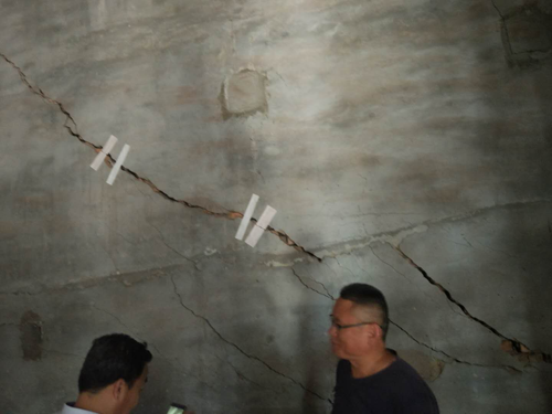 本工程勘察場地位于聊城市茌平縣,茌平華宇氧化鋁公司場內(nèi)2個堿罐與其北側2個配電室樓體周邊為本次的勘察區(qū)域。堿罐直徑8m,高10m,兩堿罐間距1.7m,現(xiàn)罐區(qū)周圍約20m×20m范圍內(nèi)土體發(fā)生膨脹,局部地面產(chǎn)生地表裂縫,兩個配電室樓體南側出現(xiàn)裂縫,裂縫位置距堿罐約30m。