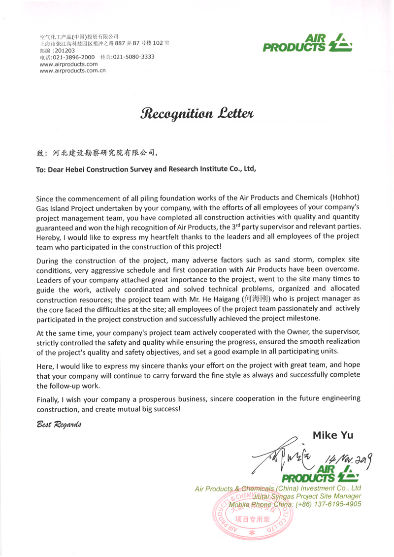 我公司承建的美國AP公司大型氣體島項目,安全、優(yōu)質(zhì)完成了全部地基處理任務(wù)。施工期間克服天氣寒冷、工期緊等因素,投入旋挖鉆機(jī)8臺套,一個月完成灌注樁20000立方,取得了業(yè)主的一致好評。