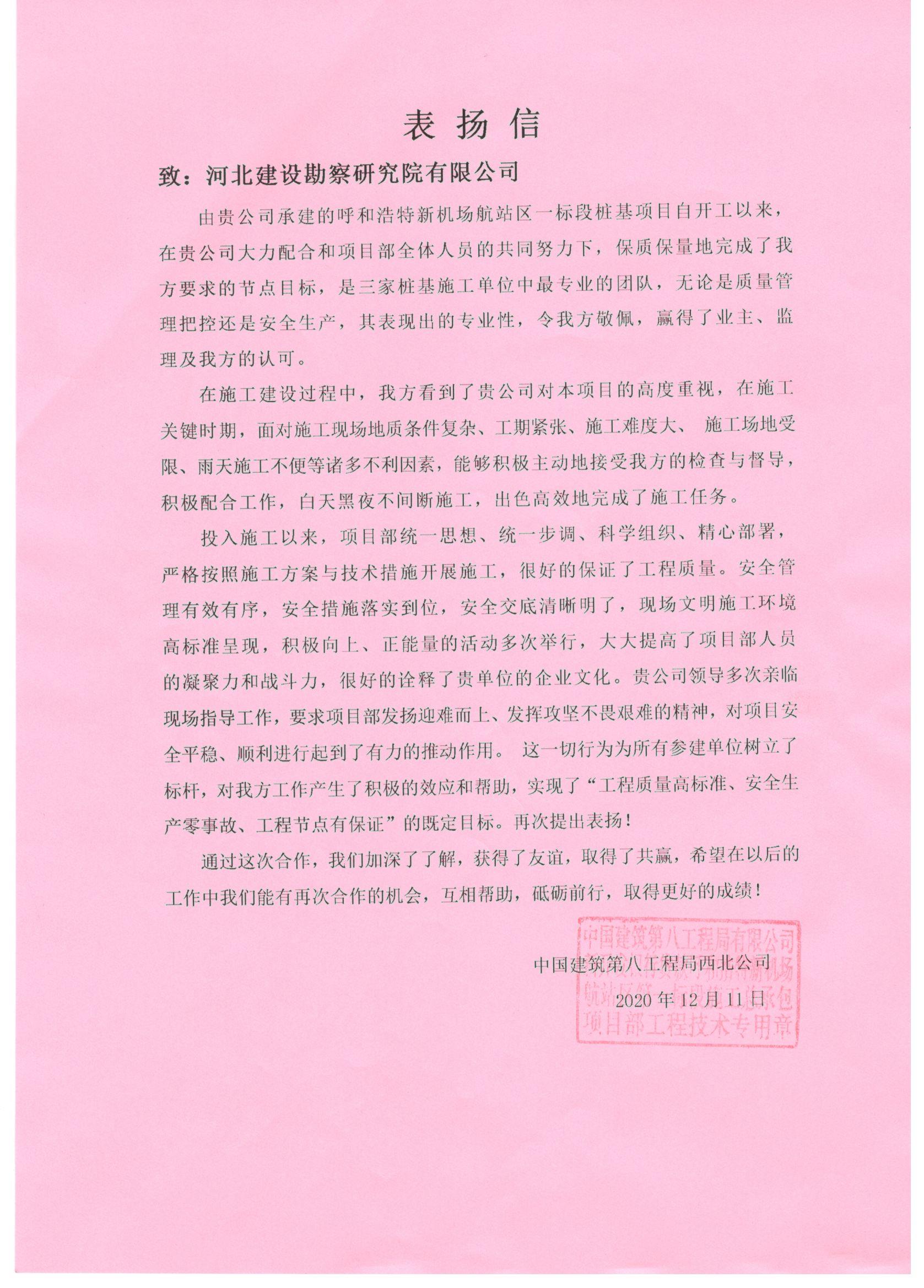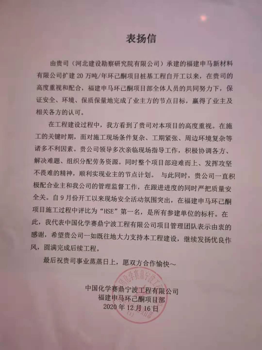 近日,公司收到中國化學(xué)賽鼎寧波工程有限公司福建申馬環(huán)己酮項(xiàng)目部、中國建筑第八工程局西北公司呼和浩特新機(jī)場航站區(qū)一標(biāo)段樁基項(xiàng)目部的表揚(yáng)信。
