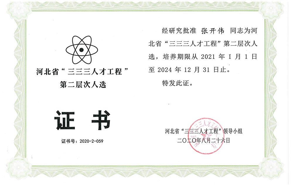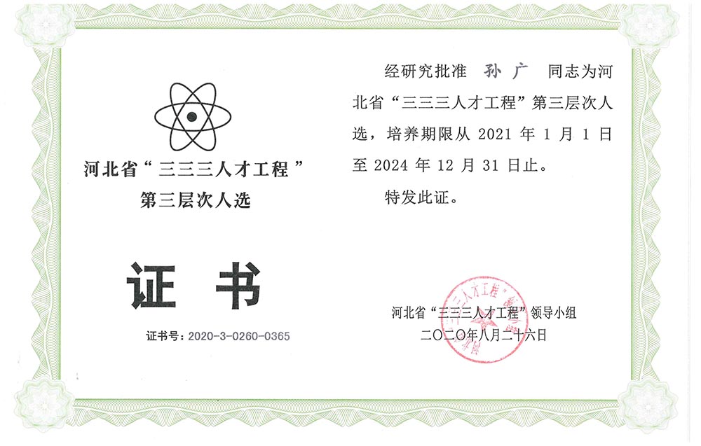 經(jīng)公司申報(bào)、石家莊市人力資源和社會(huì)保障局推薦,河北省“三三三人才工程”領(lǐng)導(dǎo)小組批準(zhǔn),公司張開偉同志榮獲2020年度河北省“三三三人才工程”第二層次人選,韓文永、孫廣兩名同志榮獲2020年度河北省“三三三人才工程”第三層次人選。