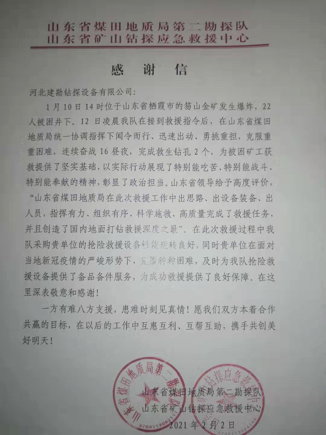 鉆探設(shè)備公司收到山東省煤田地質(zhì)局第二勘探隊、山東省礦山鉆探應(yīng)急救援中心發(fā)來的感謝信
