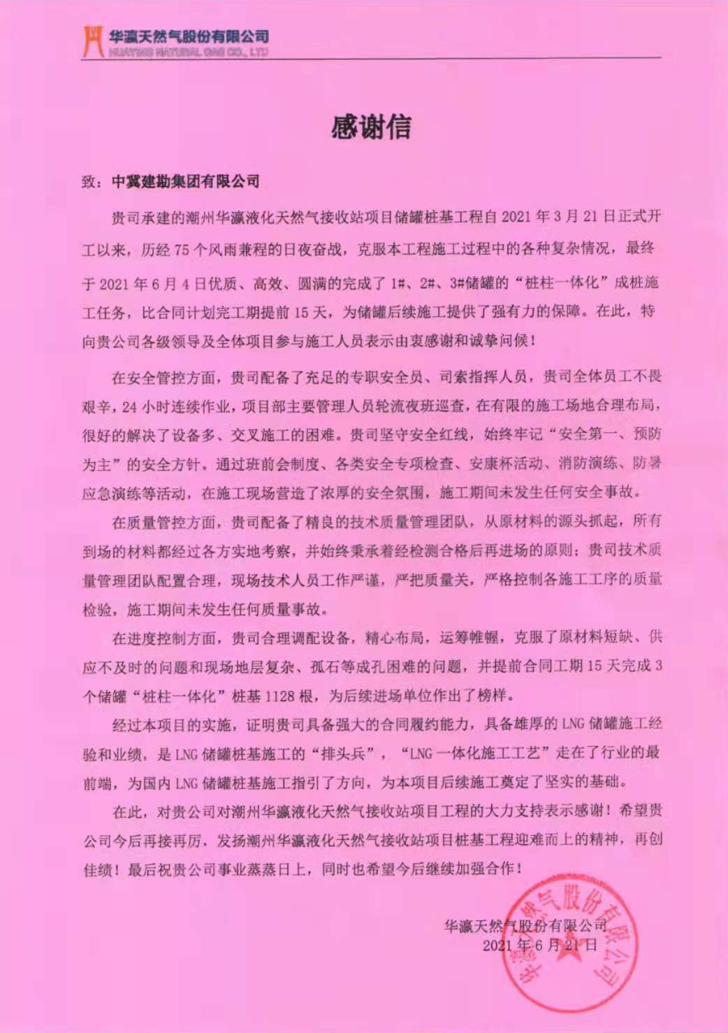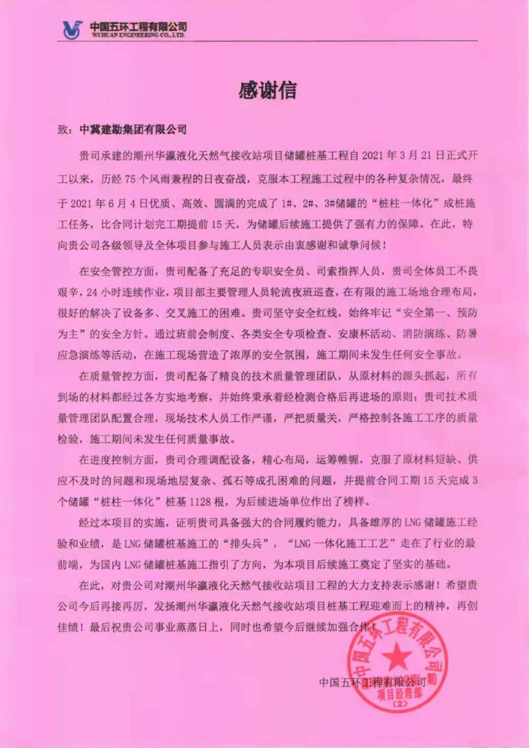 我項目部施工期間正值年初建筑市場復蘇原材料全面漲價階段,面對現(xiàn)場原材價格不斷上漲且供應不足的問題,非常感謝總公司及各位領(lǐng)導的大力支持;面對設備多、工期緊,任務重,我公司潮州華瀛LNG項目部,充分發(fā)揚能吃苦、能戰(zhàn)斗的精神,提前謀劃,合理組織、精心安排,積極配合業(yè)主進度計劃,保質(zhì)保量的比合同工期提前15日完成所有樁基施工任務。我單位在安全管理、施工質(zhì)量管理方面為建設方、監(jiān)理方、總包方留下深刻影響,為此項目部得到了中國五環(huán)工程有限公司潮州華瀛LNG項目經(jīng)理部以及華瀛天然氣股份有限公司高度認可!