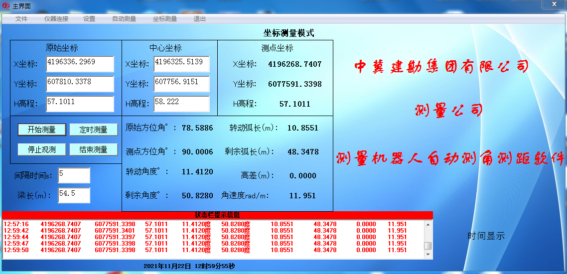 在橋梁轉(zhuǎn)體過(guò)程中,我們采用國(guó)內(nèi)最先進(jìn)的全自動(dòng)測(cè)量機(jī)器人并結(jié)合自主研發(fā)的跟蹤測(cè)量軟件,對(duì)橋梁實(shí)施運(yùn)行軌跡和震動(dòng)監(jiān)控監(jiān)測(cè)。在轉(zhuǎn)體過(guò)程中嚴(yán)格控制轉(zhuǎn)體橋轉(zhuǎn)體角速度,并對(duì)軸線合攏進(jìn)行測(cè)量,指揮施工單位對(duì)轉(zhuǎn)體橋進(jìn)行點(diǎn)動(dòng),最終達(dá)到設(shè)計(jì)要求,本次軸線合攏精度達(dá)到5mm,滿足設(shè)計(jì)要求。