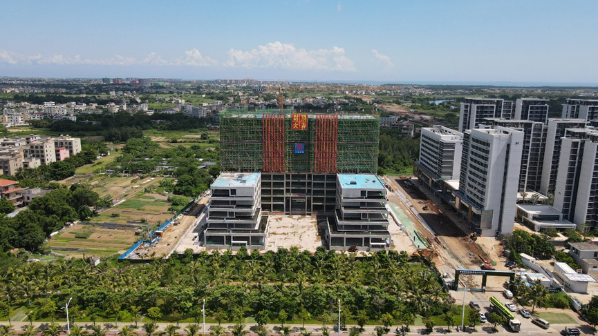 海南辦公樓占地面積15畝,地下二層,地上12層,總建筑面積47527平方米。工程自2021年9月13日現(xiàn)場舉辦開工儀式以來,經(jīng)過11個月的合力攻堅,克服高溫、臺風(fēng)、疫情等重重難關(guān),如期實現(xiàn)了一個個關(guān)鍵節(jié)點:2021年10月25日第一根基礎(chǔ)工程樁混凝土灌注順利完成;2021年12月4日開始8萬方土方開挖的任務(wù);2022年1月29日,實現(xiàn)了基礎(chǔ)筏板的澆筑;2022年4月10日,完成了地下二層車庫施工,主體如期“沖”出正負(fù)零;2022年6月24日,東、西配樓主體按計劃日期封頂。如今項目迎來了主體封頂?shù)睦锍瘫?,為后期工程樹立了?biāo)桿!