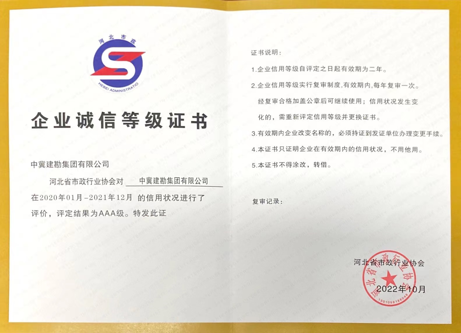 公司獲得“2021年度河北省市政行業(yè)AAA級(jí)誠(chéng)信企業(yè)”榮譽(yù)稱號(hào)