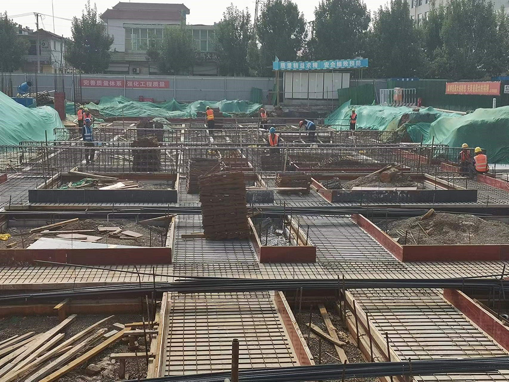 本工程特點(diǎn)如下:①施工場(chǎng)地小,施工材料堆放集中,二次搬運(yùn)多;②施工過(guò)程中勞動(dòng)力集中,各專業(yè)穿插作業(yè)多,其中基礎(chǔ)施工時(shí)需3天內(nèi)組織接近200人同時(shí)施工,在新冠疫情影響下組織如此規(guī)模人員短時(shí)間進(jìn)場(chǎng)難度較大;③技術(shù)重點(diǎn)多,項(xiàng)目部經(jīng)過(guò)科學(xué)嚴(yán)密的組織和監(jiān)管成功的把控了各個(gè)施工環(huán)節(jié)質(zhì)量,保證工程達(dá)到驗(yàn)收標(biāo)準(zhǔn)。