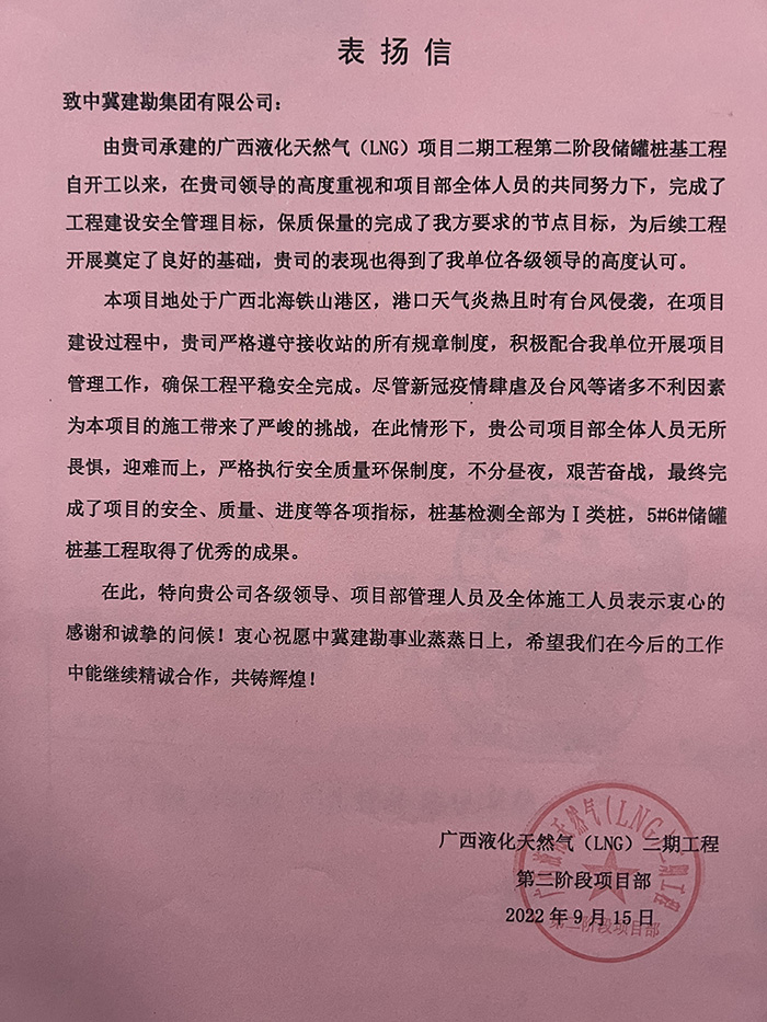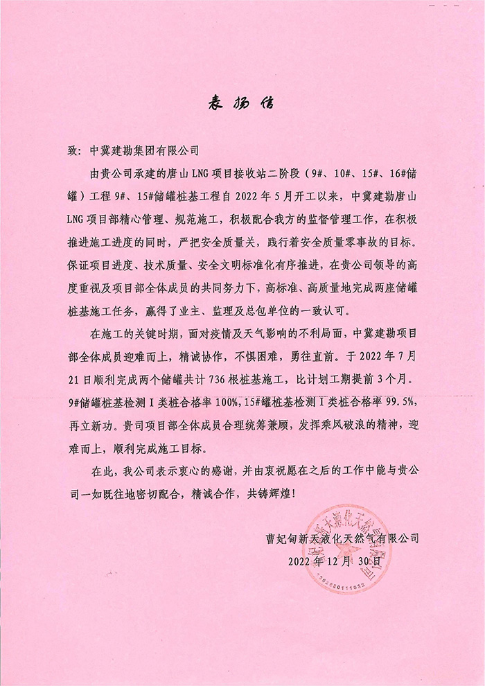 2022年12月30日我公司收到業(yè)主曹妃甸新天液化天然氣有限公司發(fā)來的表揚信。由我公司承建的唐山LNG項目接收站二階段(9#、10#、15#、16#儲罐)工程9#、15#儲罐樁基工程,主要施工內(nèi)容為736根樁徑1.4m、樁長71m/74m混凝土灌注樁,本項目自2022年5月31日開工以來,在唐山LNG項目部精心管理、規(guī)范施工下,嚴把安全質(zhì)量關(guān),踐行著安全質(zhì)量零事故目標(biāo),于2022年7月21日順利完成所有施工任務(wù),贏得業(yè)主、監(jiān)理及總包的一致認可。樁基檢測完成后,9#儲罐樁基檢測I類樁率100%,15#儲罐I類樁率99.5%,再創(chuàng)新高。在施工過程中,項目部全體成員面對惡劣天氣的不利影響及新冠疫情肆虐的局面,迎難而上,精誠協(xié)作,砥礪前行,淋漓盡致地詮釋了建勘人的鐵軍精神,為項目順利完成奠定堅實基礎(chǔ)。