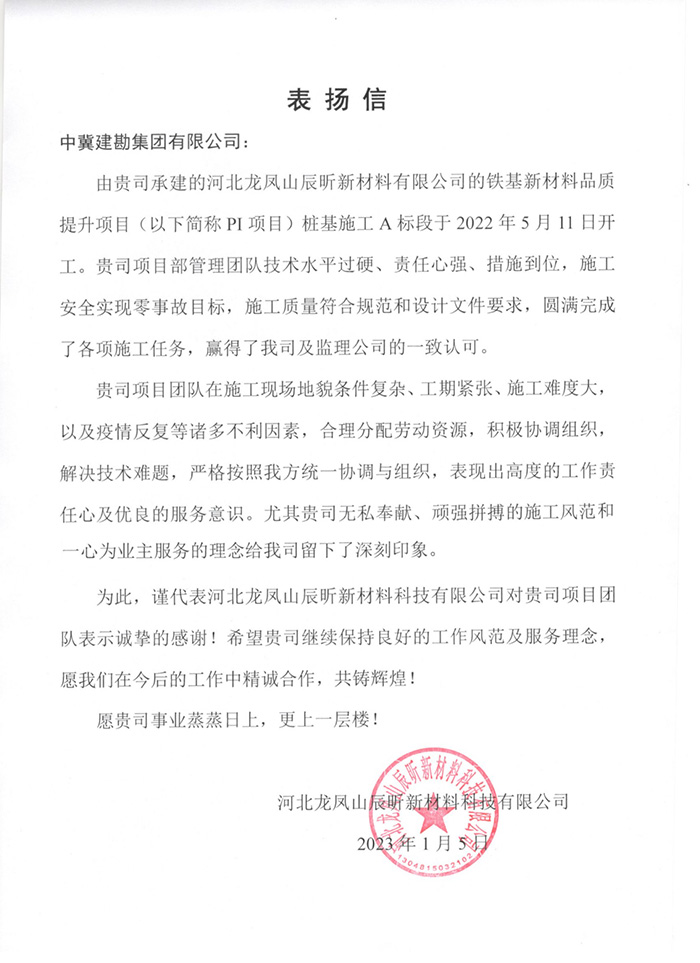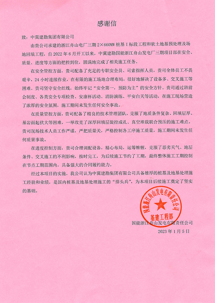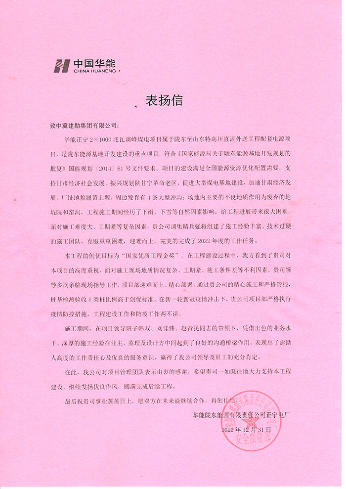 我公司華能甘肅正寧電廠二期工程項目部收到業(yè)主方華能隴東能源公司正寧電廠發(fā)來的表揚信,施工期間,在項目領(lǐng)導(dǎo)的帶領(lǐng)下,憑借出色的業(yè)務(wù)水平、深厚的施工經(jīng)驗在業(yè)主、監(jiān)理及設(shè)計方中間起到了良好的溝通橋梁作用。本工程的創(chuàng)優(yōu)目標(biāo)為“國家優(yōu)質(zhì)工程金獎”,我單位負責(zé)的B標(biāo)段樁基檢測驗收I類樁比例高于創(chuàng)優(yōu)標(biāo)準。在新一輪新冠疫情沖擊下,項目部嚴格執(zhí)行疫情防控措施,工程建設(shè)工作和防疫工作兩不誤表現(xiàn)出了建勘人高度的工作責(zé)任心及優(yōu)良的服務(wù)意識,贏得了華能隴東能源公司領(lǐng)導(dǎo)及員工的充分肯定。