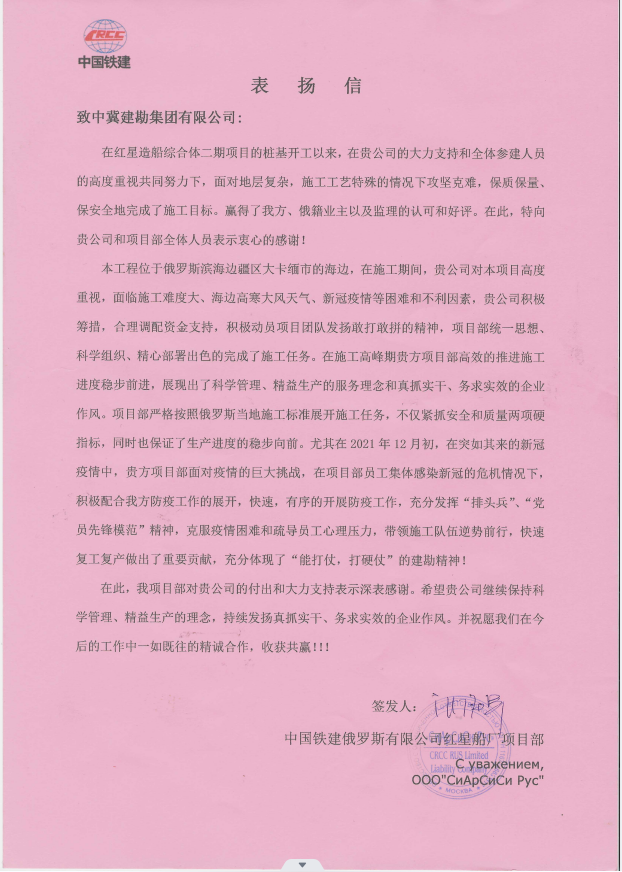 俄羅斯海參崴紅星造船綜合體(二期)項目,收到中國鐵建俄羅斯紅星船廠項目部的表揚信,施工期間,在項目領(lǐng)導(dǎo)的帶領(lǐng)下,項目部統(tǒng)一思想、科學(xué)組織,經(jīng)過305天的奮戰(zhàn),項目部完成了質(zhì)量安全零事故,保質(zhì)保量促進生產(chǎn)的任務(wù)目標(biāo)。我公司負責(zé)的302、303、304廠房樁基檢測驗收全部合格。在施工高峰期克服了 新冠疫情、高寒天氣、俄烏戰(zhàn)爭影響等諸多困難和不利因素,采取24小時不間斷施工,積極調(diào)配合理高效的推進施工進度穩(wěn)步前進。尤其在突如其來的新冠疫情中,項目部面對疫情的巨大挑戰(zhàn),積極采取措施,配合防疫工作的展開,快速,有序的開展隔離工作,安撫感染人員恐慌情緒。這種科學(xué)防疫、積極組織為后期快速復(fù)工復(fù)產(chǎn)做出了重要貢獻,得到了總包單位的充分肯定和表揚。