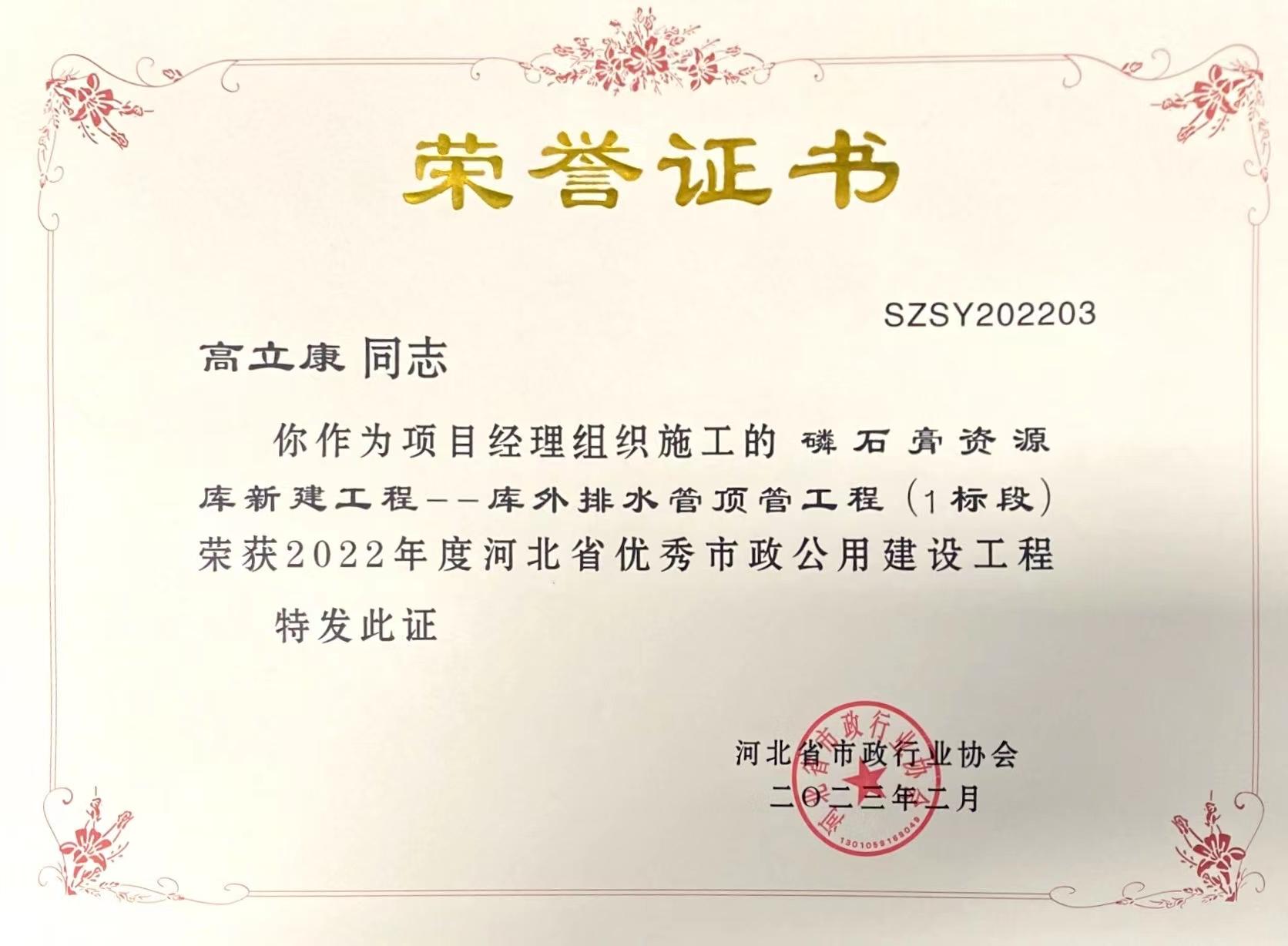 近日,河北省市政行業(yè)協(xié)會發(fā)布消息,經(jīng)過審核申報(bào)材料、查驗(yàn)施工現(xiàn)場、專家綜合評議,我公司市政工程項(xiàng)目“磷石膏資源庫新建工程——庫外水管頂管工程(1標(biāo)段)”被評為河北省優(yōu)秀市政公用建設(shè)工程,并為項(xiàng)目經(jīng)理高立康同志頒發(fā)了榮譽(yù)證書。