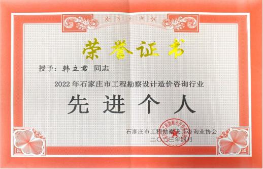 近日,石家莊市工程勘察設(shè)計(jì)咨詢(xún)業(yè)協(xié)會(huì)下發(fā)《關(guān)于表彰2022年石家莊市工程勘察設(shè)計(jì)造價(jià)咨詢(xún)行業(yè)先進(jìn)單位和先進(jìn)個(gè)人的通知》(石設(shè)協(xié)字【2023】2號(hào)),我公司被授予“2022年石家莊市工程勘察設(shè)計(jì)造價(jià)咨詢(xún)行業(yè)先進(jìn)單位”稱(chēng)號(hào),韓立君同志、商衛(wèi)東同志被授予“2022年石家莊市工程勘察設(shè)計(jì)造價(jià)咨詢(xún)行業(yè)先進(jìn)個(gè)人”稱(chēng)號(hào)。