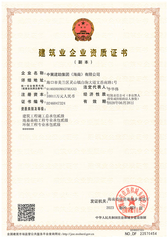 中冀建勘集團(tuán)(海南)有限公司喜獲建筑業(yè)企業(yè)貳級資質(zhì)證書