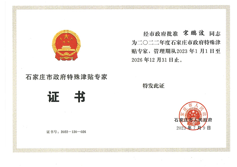 經(jīng)公司組織推薦,石家莊市人力資源和社會保障局組織評審,社會公示,石家莊市人民政府批準,我公司宋鵬波同志榮獲2022年度石家莊市政府特殊津貼專家。