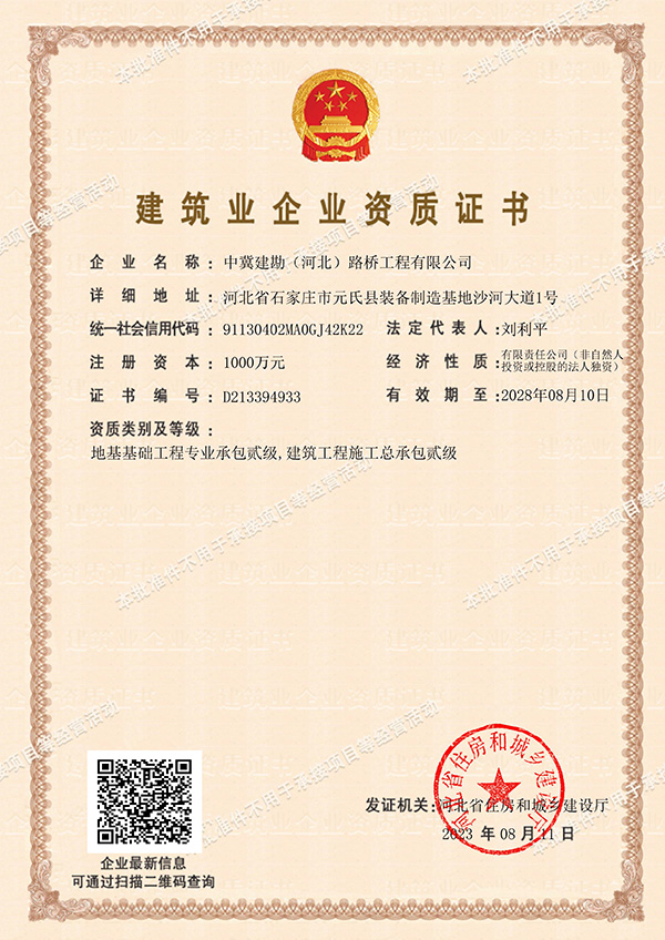 中冀建勘(河北)路橋工程有限公司取得建筑工程施工總承包貳級(jí)、地基基礎(chǔ)工程專業(yè)承包貳級(jí)資質(zhì)證書