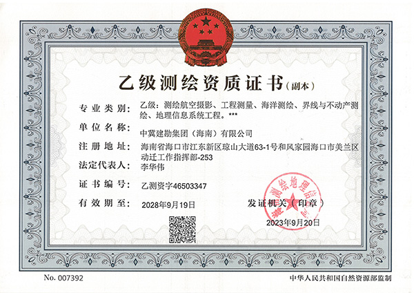 在集團公司領導的正確領導下,經(jīng)過工程測量公司和安全生產(chǎn)部的精心運作,中冀建勘集團(海南)有限公司于2023年9月20日取得了海南測繪地理信息局頒發(fā)的測繪乙級資質(zhì),資質(zhì)包含五個專業(yè):測繪航空攝影、工程測量、海洋測繪、界線與不動產(chǎn)測繪、地理信息系統(tǒng)工程。