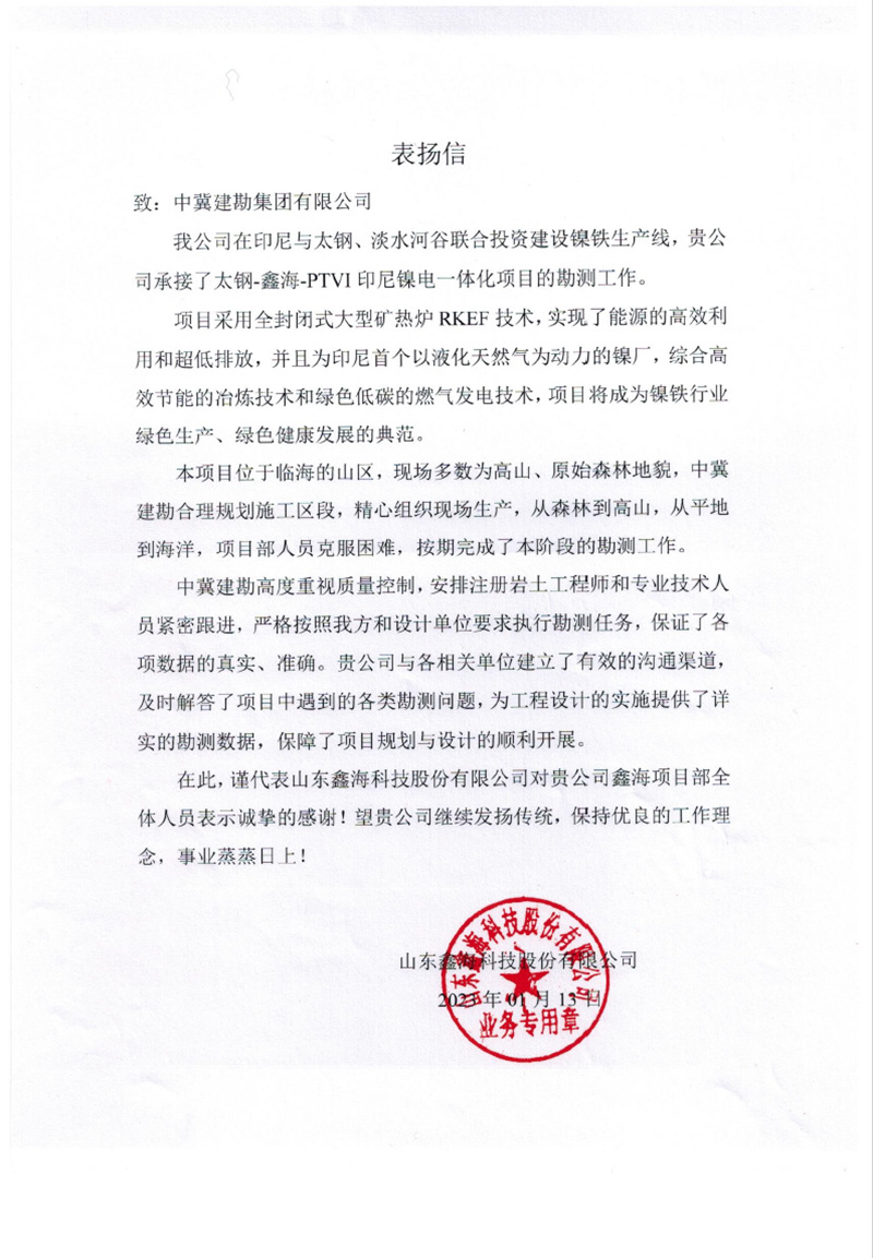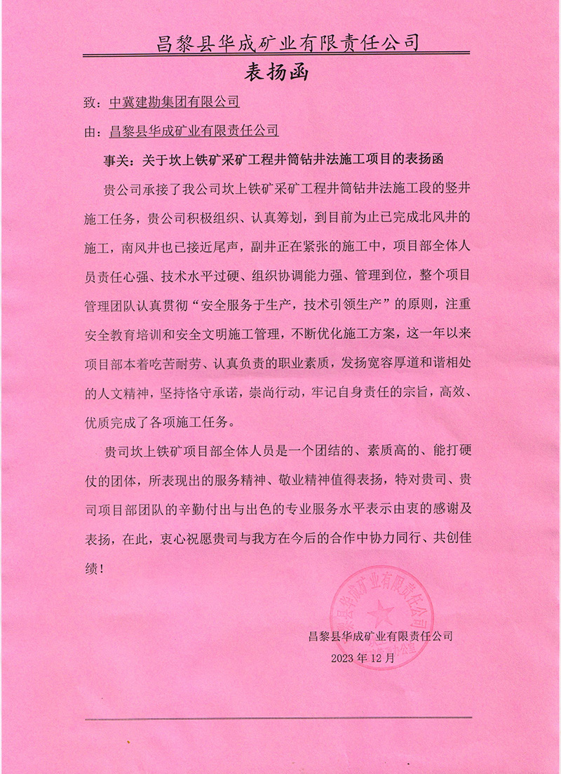 昌黎縣華成礦業(yè)有限責任公司發(fā)來的表揚函,對我公司在坎上鐵礦采礦工程井筒鉆進法施工項目施工過程中,積極組織,認真籌劃,以及項目部全體人員責任心強、技術(shù)水平過硬、組織協(xié)調(diào)能力強、管理到位,認真貫徹“安全服務(wù)于生產(chǎn),技術(shù)引領(lǐng)生產(chǎn)”的原則,不斷優(yōu)化施工方案,已順利完成北風井的施工,南風井也即將完成,表示由衷的感謝和表揚,希望今后合作中協(xié)力同行、共創(chuàng)佳績。