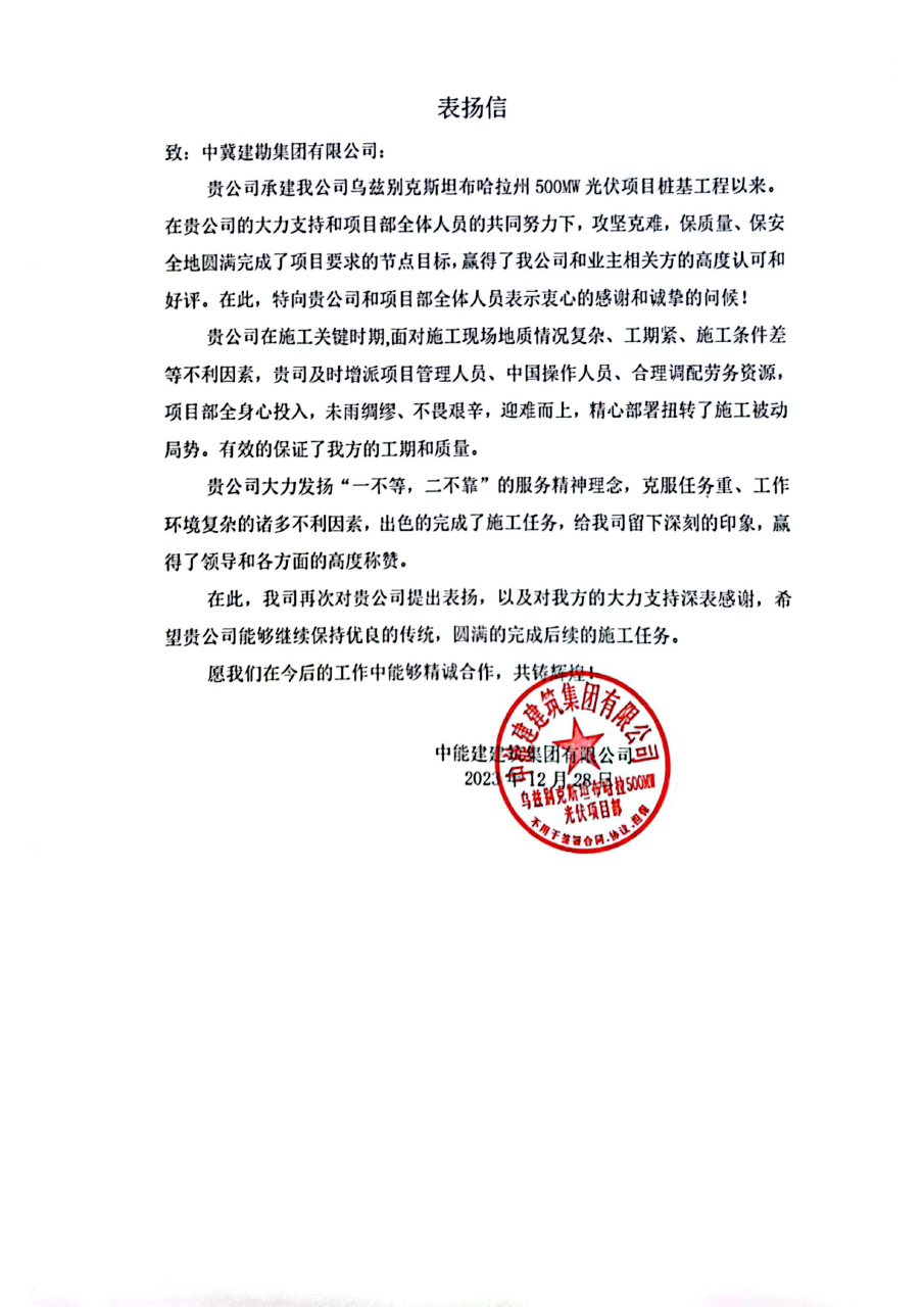 中能建建筑集團有限公司發(fā)來的表揚信,對在烏茲別克斯坦布哈拉州500MW光伏項目建設(shè)過程中,項目部全體人員發(fā)揚“一不等,二不靠”的服務(wù)理念,克服工作環(huán)境和地質(zhì)復(fù)雜等困難,在公司的大力支持和項目全體人員的共同努力下,圓滿完成了項目要求的節(jié)點目標,特向我公司表示衷心的感謝和誠摯的問候,愿今后繼續(xù)精誠合作,共鑄輝煌。