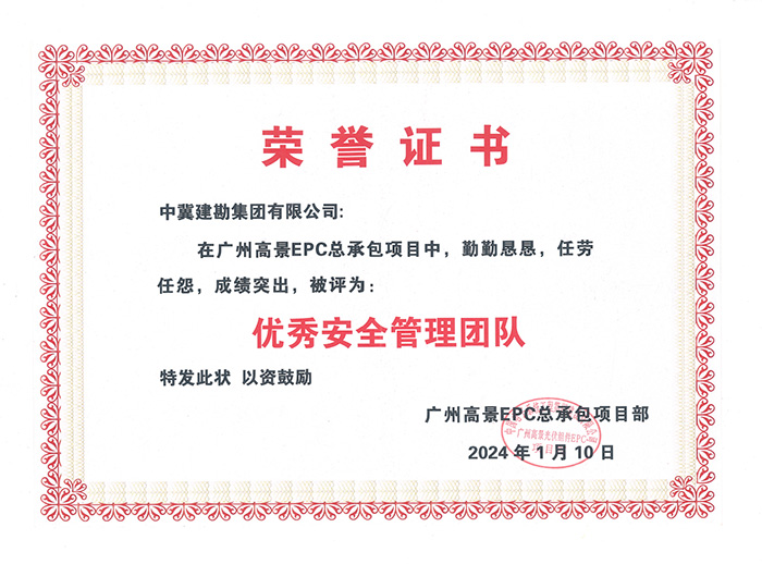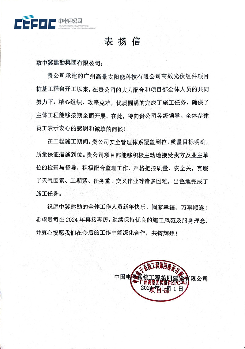 中國電子系統(tǒng)工程第四建設(shè)有限公司發(fā)來的表揚信,對我公司在廣州高景太陽能科技有限公司高效光伏組件項目建設(shè)過程中,公司的大力配合和項目部全體人員的共同努力下,安全管理體系覆蓋到位,質(zhì)量保證措施到位,嚴格把控質(zhì)量、安全關(guān),出色完成了施工任務(wù),特向我公司各級領(lǐng)導(dǎo)、全體參建員工表示衷心的感謝,并授予“優(yōu)秀安全管理團隊”和“優(yōu)秀資料包商”榮譽。