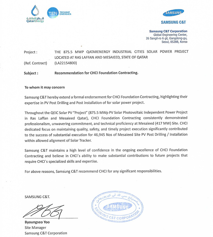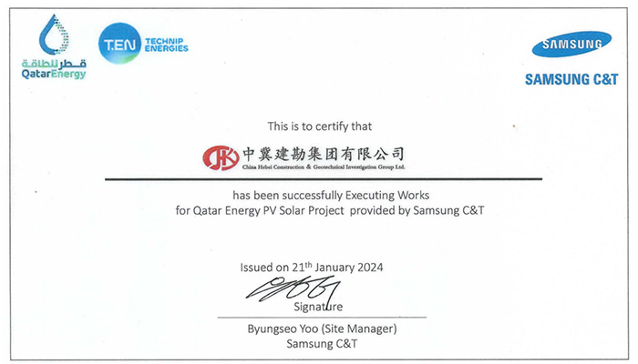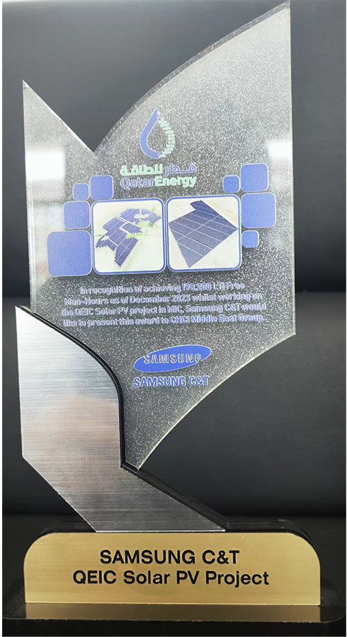 我公司收到卡塔爾能源875.5MW光伏發(fā)電項(xiàng)目業(yè)主方卡塔爾能源和總包方三星C&T公司聯(lián)合頒發(fā)的獎(jiǎng)杯和推薦信。業(yè)主及總包方高度認(rèn)可我公司項(xiàng)目履約能力,贊揚(yáng)我司對(duì)該項(xiàng)目成功交付做出重大貢獻(xiàn),表示愿意與我司建立長期合作關(guān)系?;谖宜咀吭降穆募s表現(xiàn),三星C&T公司授予我司推薦信。