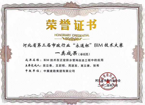 近日,河北省市政行業(yè)協(xié)會(huì)發(fā)文《關(guān)于公布河北省第三屆市政行業(yè)“永通杯”BIM技術(shù)大賽結(jié)果的通知》(冀市協(xié)〔2024〕21號(hào)),我公司參賽項(xiàng)目“BIM 技術(shù)在正定排水管網(wǎng)改造工程中的應(yīng)用”項(xiàng)目榮獲一類成果。