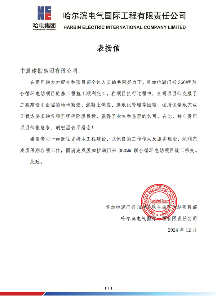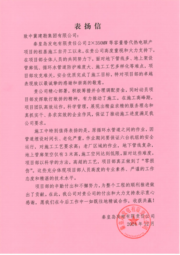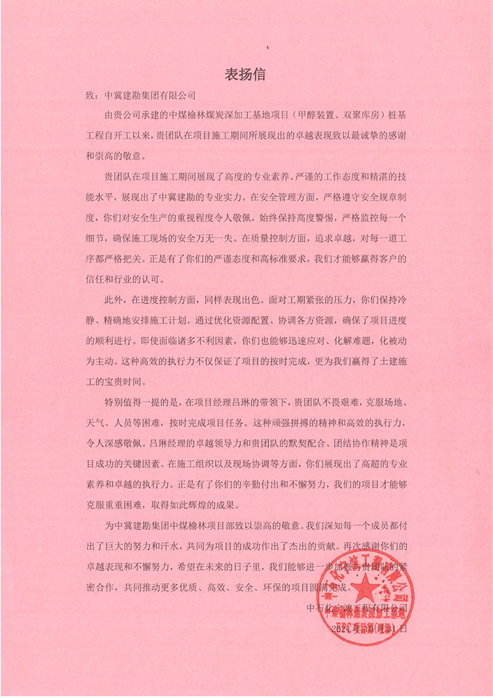 一封封表揚(yáng)信,是榮譽(yù),更是責(zé)任與動(dòng)力。我們深知,每一次的認(rèn)可都是對(duì)過去成績(jī)的總結(jié),而未來的道路仍需我們不斷探索與前行。我們將以此為契機(jī),繼續(xù)秉承相關(guān)方利益最大化的工作方針,實(shí)現(xiàn)長(zhǎng)期可持續(xù)發(fā)展,不斷提升自我,優(yōu)化服務(wù),致力于成為更多業(yè)主信賴的伙伴。一公司將進(jìn)一步加強(qiáng)內(nèi)部管理,提升服務(wù)質(zhì)量,確保每一個(gè)項(xiàng)目都能成為展示公司實(shí)力與品牌形象的窗口,致力于建設(shè)國際一流巖土工程科技集團(tuán),用實(shí)際行動(dòng)踐行“永葆基業(yè)長(zhǎng)青”的誓言。