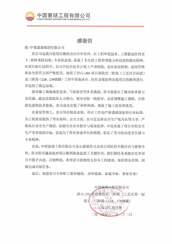 近期,一公司陸續(xù)收到國電電力秦皇島發(fā)電有限公司、中國寰球工程有限公司、中石化寧波工程有限公司、海洋工程股份有限公司、哈爾濱電氣國際工程有限公司等項(xiàng)目發(fā)的來感謝信、表揚(yáng)信以及優(yōu)秀承包商、優(yōu)秀施工單位榮譽(yù)證書。繽紛而至的感謝信及榮譽(yù)證書不僅是對(duì)我們過去努力的肯定,更是對(duì)未來合作的美好期許,為公司的發(fā)展歷程增添了濃墨重彩的一筆。