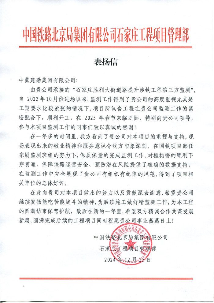 石家莊市勝利大街道路提升涉鐵工程鐵路設(shè)施安全監(jiān)測(cè)項(xiàng)目,六公司通過高精度的測(cè)繪和實(shí)時(shí)監(jiān)測(cè),確保了鐵路設(shè)施的安全運(yùn)營(yíng),贏得了中國(guó)鐵路北京局的高度評(píng)價(jià)。京石客專石家莊樞紐改造工程,我們的精準(zhǔn)監(jiān)測(cè)工作為工程的順利進(jìn)行提供了堅(jiān)實(shí)的數(shù)據(jù)支持,獲得了中鐵六局的高度認(rèn)可和表揚(yáng)。