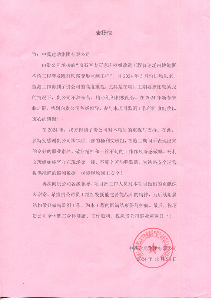 近期,集團(tuán)公司陸續(xù)收到中國(guó)鐵路北京局集團(tuán)有限公司、中鐵六局集團(tuán)有限公司、新疆兵準(zhǔn)信弘能源有限責(zé)任公司、任丘市供水有限公司發(fā)來的感謝信、表揚(yáng)信以及優(yōu)秀合作單位榮譽(yù)獎(jiǎng)牌、先進(jìn)工作者榮譽(yù)證書。