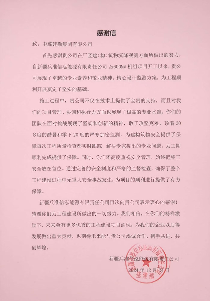 新疆昌吉兵準(zhǔn)信泓能源2x600MW機(jī)組沉降觀測(cè)項(xiàng)目,新疆項(xiàng)目部職工不畏嚴(yán)寒酷暑,頂著30多度的酷暑和零下20多度的極冷天氣加密監(jiān)測(cè),為廠區(qū)建構(gòu)筑物安全提供了數(shù)據(jù)保障,每次工程質(zhì)量檢查都實(shí)時(shí)跟蹤,解決專家提出的專業(yè)問題,為工期順利完成提供了保障。業(yè)主單位特發(fā)來感謝信深表感謝!