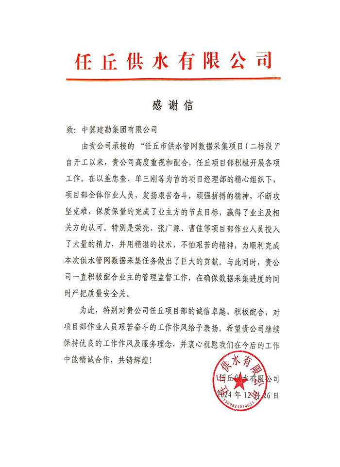 任丘市供水管網(wǎng)數(shù)據(jù)采集(二標(biāo)段)項(xiàng)目,自開工以來領(lǐng)導(dǎo)十分重視,統(tǒng)籌安排,精心組織,項(xiàng)目部全體作業(yè)人員發(fā)揚(yáng)艱苦奮斗,頑強(qiáng)拼搏的精神,不斷攻堅(jiān)克難,保質(zhì)保量順利完成了供水管網(wǎng)數(shù)據(jù)采集項(xiàng)目。我公司認(rèn)真負(fù)責(zé)、誠(chéng)信卓越、一心為業(yè)主服務(wù)的工作精神贏得了業(yè)主的高度認(rèn)可和贊揚(yáng),同時(shí)對(duì)本項(xiàng)目表現(xiàn)突出的工作人員頒發(fā)了“2024年度先進(jìn)工作者”榮譽(yù)證書。