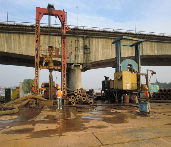 本工程是石長(zhǎng)鐵路的復(fù)線(xiàn)工程,橋址位于湖南省常德市。施工時(shí)間為2010年5月31日至2010年12月31日。采用GF300、ZSD300型回轉(zhuǎn)鉆機(jī)、TR400C旋挖鉆機(jī)及YCJF-250型沖擊反循環(huán)鉆機(jī)成孔,泥漿護(hù)壁工藝。共完成Φ1.8m~Φ2.5m基樁38根,混凝土灌注量8000余方。