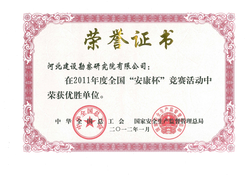 公司在2011年度“安康杯”競(jìng)賽活動(dòng)中,被中華全國總工會(huì)、國家安全生產(chǎn)監(jiān)督管理總局評(píng)為優(yōu)勝單位,這是我公司連續(xù)第八年獲此殊榮。